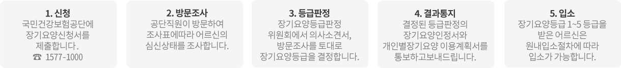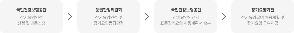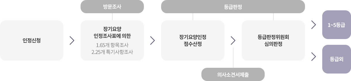 먼저 공단에 장기요양인정신청으로부터 출발하여 공단직원의 방문에 의한 인정조사와 등급판정위원회의 등급판정 그리고 장기요양인정서와 개인별장기요양이용계획서의 작성 및 송부로 이루어집니다.